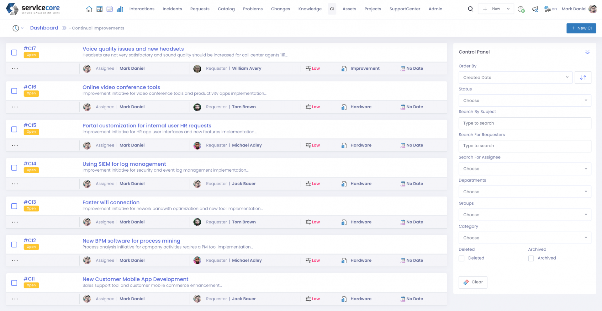Continuous improvement is the first step in implementing ITSM. It is the most important ITIL practice and serves as the precursor to all processes. Additionally, CI ensures the quality of other ITSM processes and services within organizations. Servicecore CI module has been developed in full compliance with ITIL4.