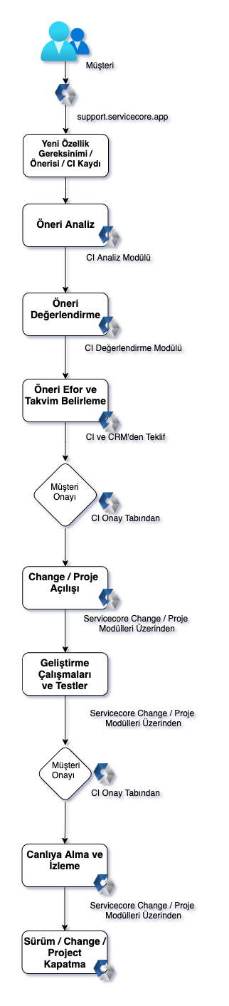 Eposta yada toplantı ile iletilen bu tür gereksinimler CI olarak support.servicecore.app ortamında kayıt altına alınır.