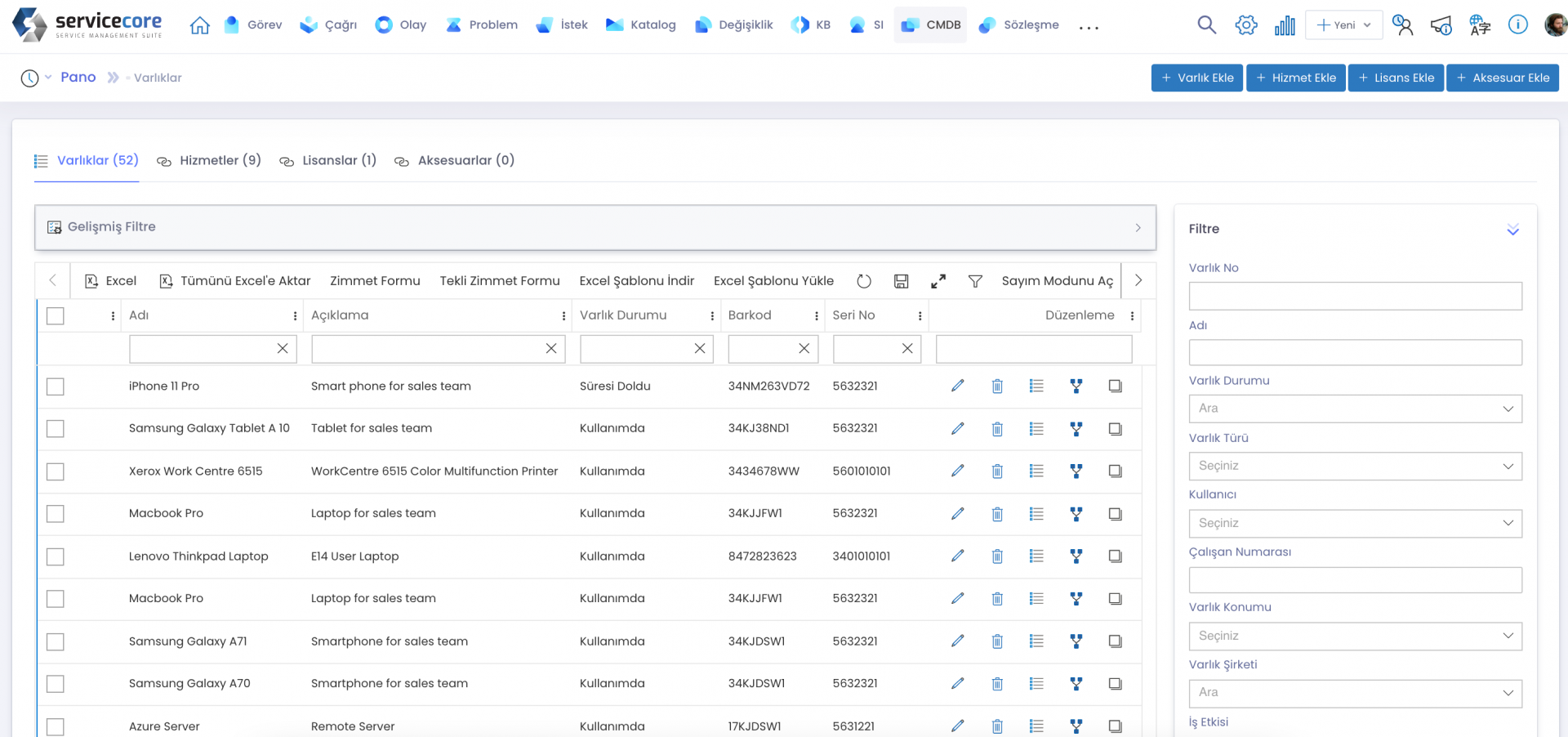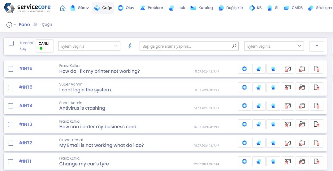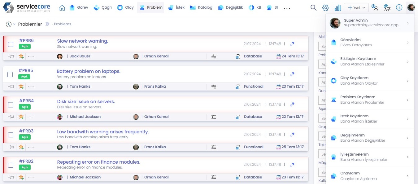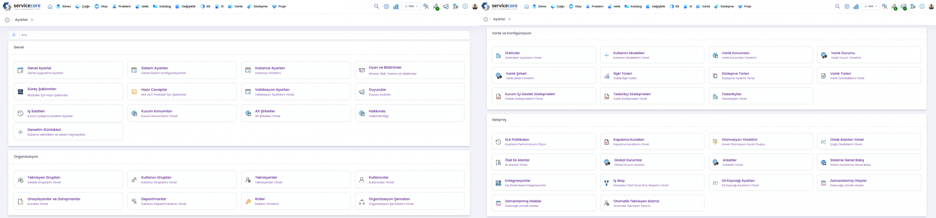 Olay, Problem, İstek, Değişiklik ve Konfigrasyon yönetimi süreçleriyle entegre olan bu modül ile varlıkları tüm süreçler boyunca takip edin.