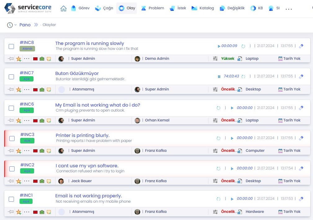 Servicecore modern ve sezgisel kullanıcı arayüzü minimum düzeyde eğitim gerektirir veya hiç gerektirmez ve BT ve BT dışı ihtiyaçlara göre özelleştirilebilir. BT uzmanları için ITSM uzmanları tarafından tasarlanan kusursuz olay yönetimi deneyimi.
