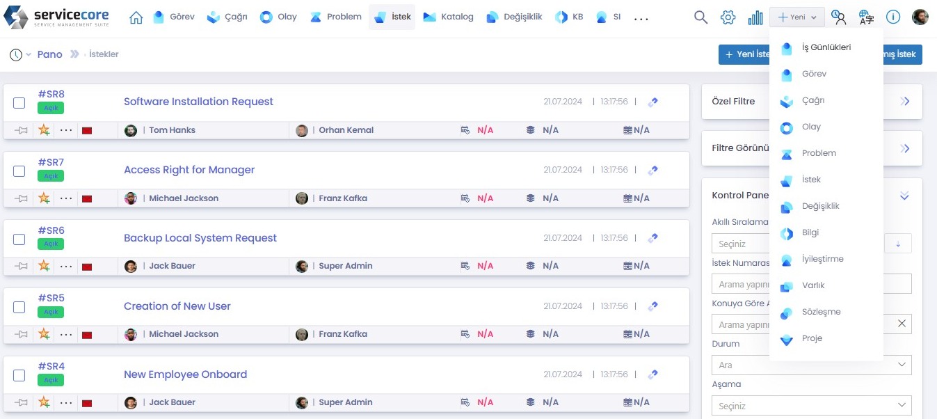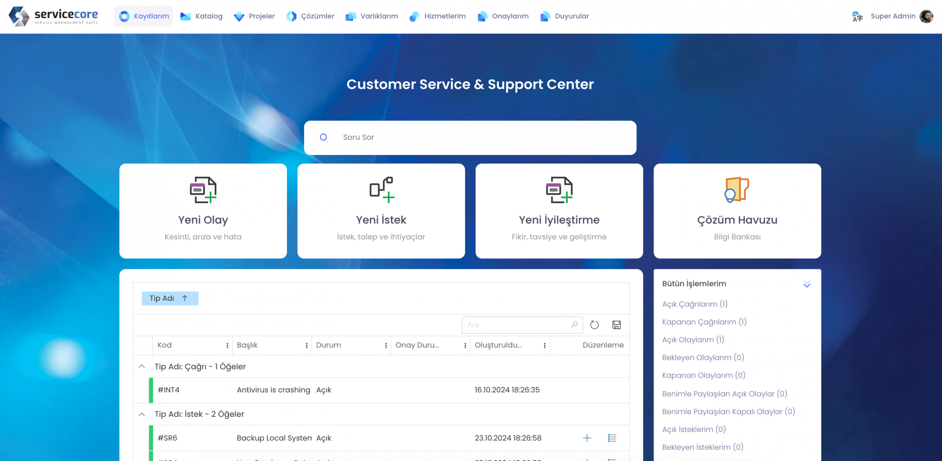 Kullanıcılarınız olaylarını, isteklerini, değişikliklerini, çözümleri, projelerini, varlıklarını ve destek ekiplerinizle olan tüm etkileşimlerini bu portal üzerinden takip edebilirler.
