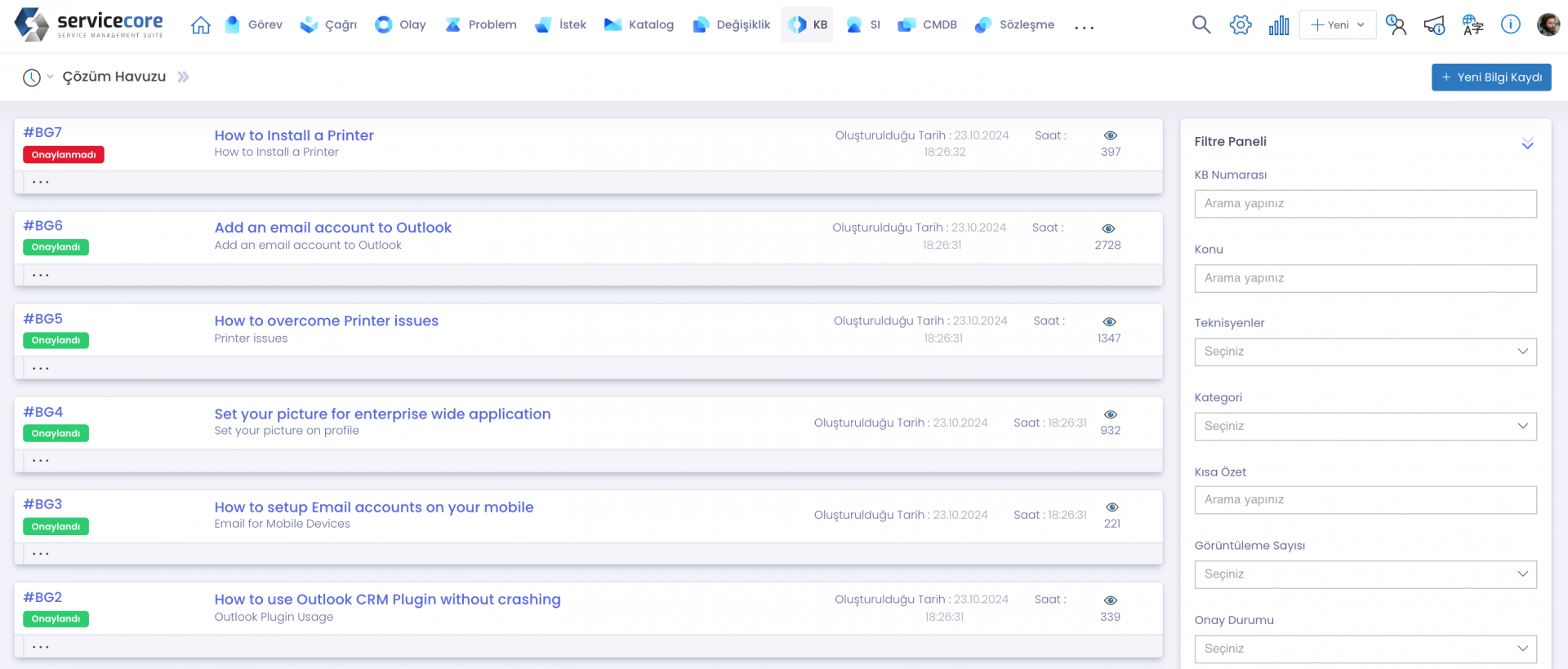 Servis Bilgi Yönetim Sistemi, hem aracılar hem de kullanıcılar için çözümleri ve makaleleri bulmayı ve ilişkilendirmeyi kolaylaştırır.