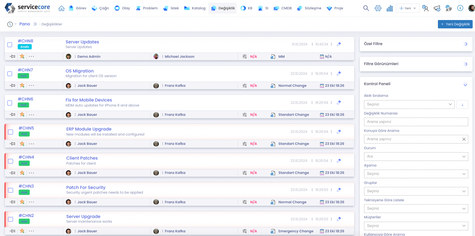 Değişikliklerin kayıt altına alınması ve koordinasyonunu kolaylaştıran bu modülde tüm değişiklik türlerine özgü akışlarla uyumlu bir yönetim paneli teknisyenleri karşılaşmaktadır.