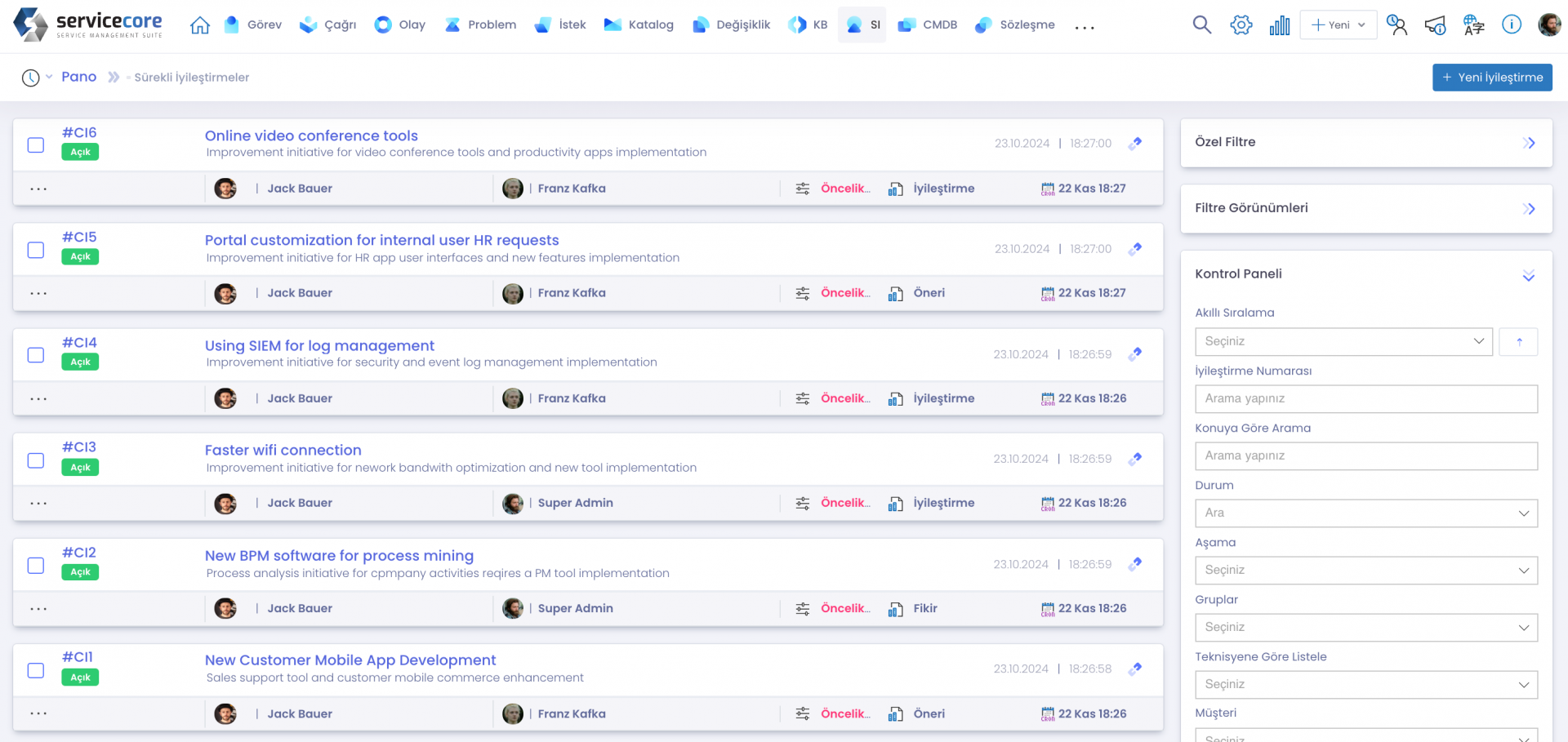 Süreç ve servis raporlarından gelen sonuçların yanısıra, tüm teknik ekip ve kullanıcılardan gelecek iyileştirme önerileri de interaction katmanında yakalanıp iyileştirme fırsatları olarak CI modülünde takip edilmektedir.