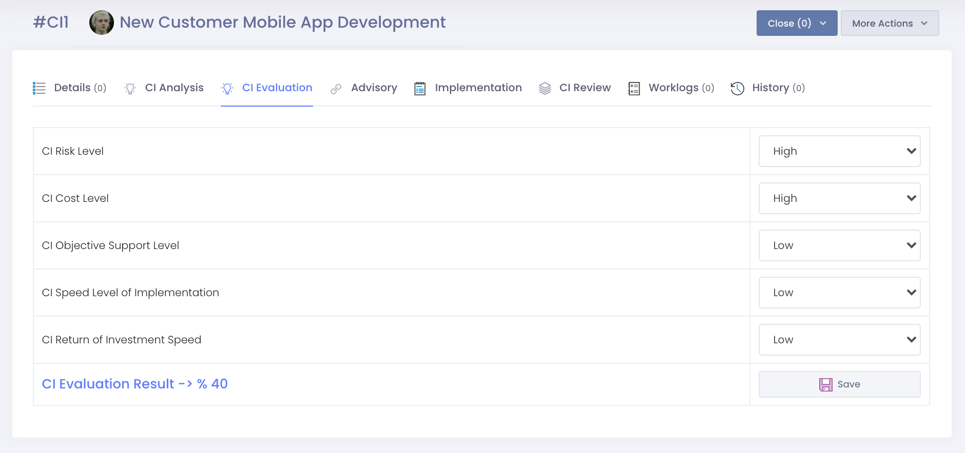 ITIL4 CI Pratiğinde açıklanan “Continual Improvement Model”e birebir uyumlu şekilde geliştirilen Servicecore CI modülü ile sürekli iyileştirme çalışmaları bu şekilde yönetilir.