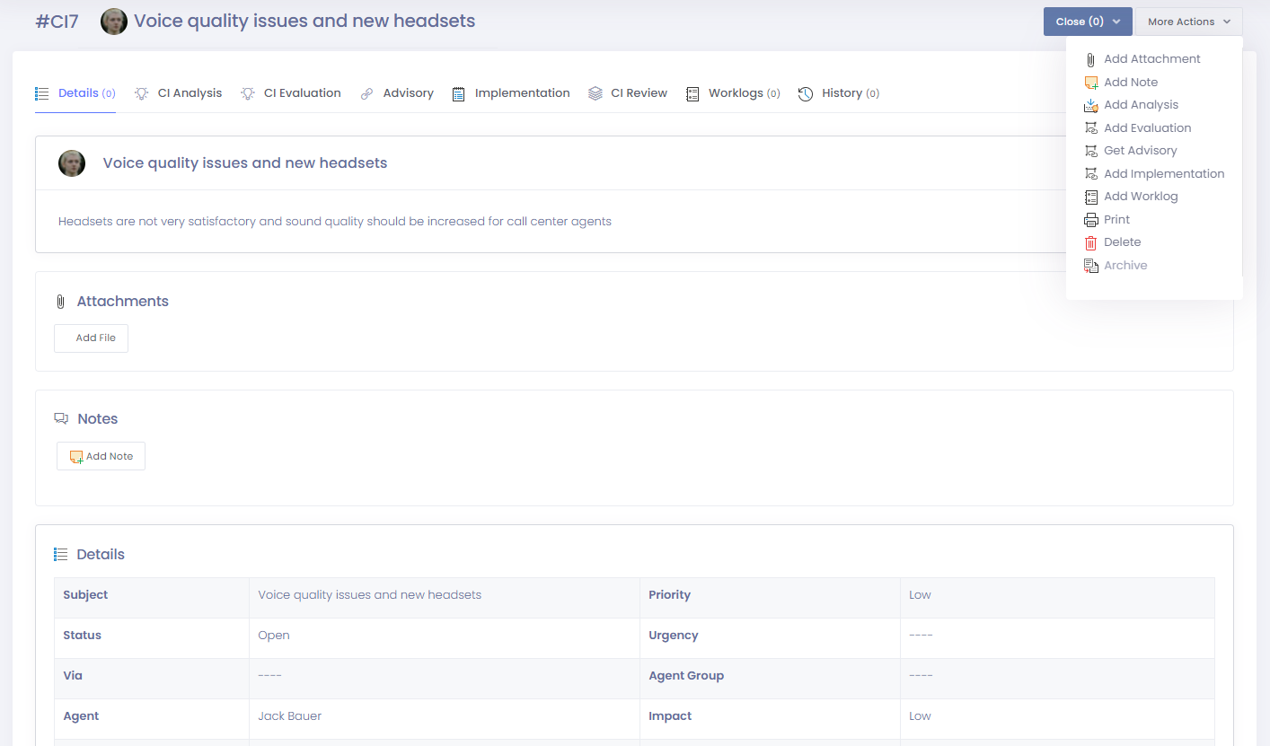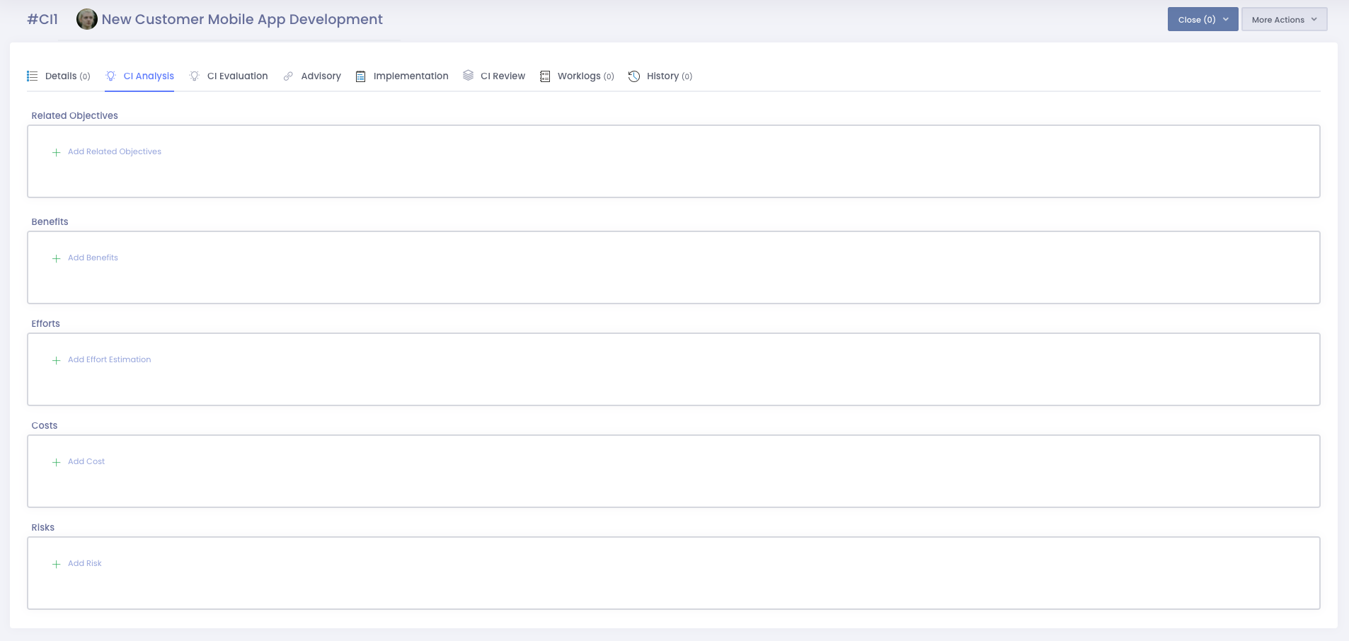 Tüm bu aşamalardan geçen bir iyileştirmenin devreye alınıp alınmayacağı, önceliğinin ne olacağı, ne zamana kadar yapılması gerektiği konusundaki kararlar CI Details bölümünde ve sağ panelde yer alan Properties alanında kayıt altına alınır.