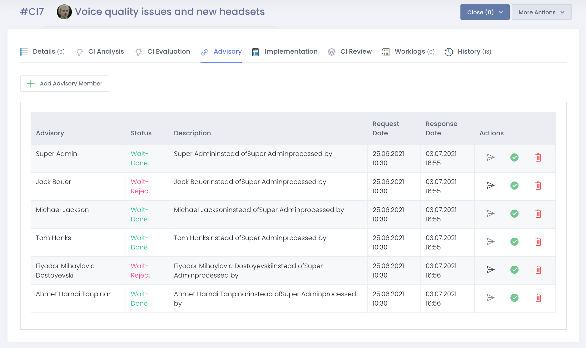 Servicecore CI modülünde bir sonraki aşama ilgili iyileştirme ile ilgili tüm ilgili paydaşlardan (servis sahibi, ürün sahibi, müşteri, diğer planlama ve tasarım süreçleri, sistem yöneticileri, yazılım ve altyapı ekipleri ve kullanıcılar vb) görüş toplanmasıdır.